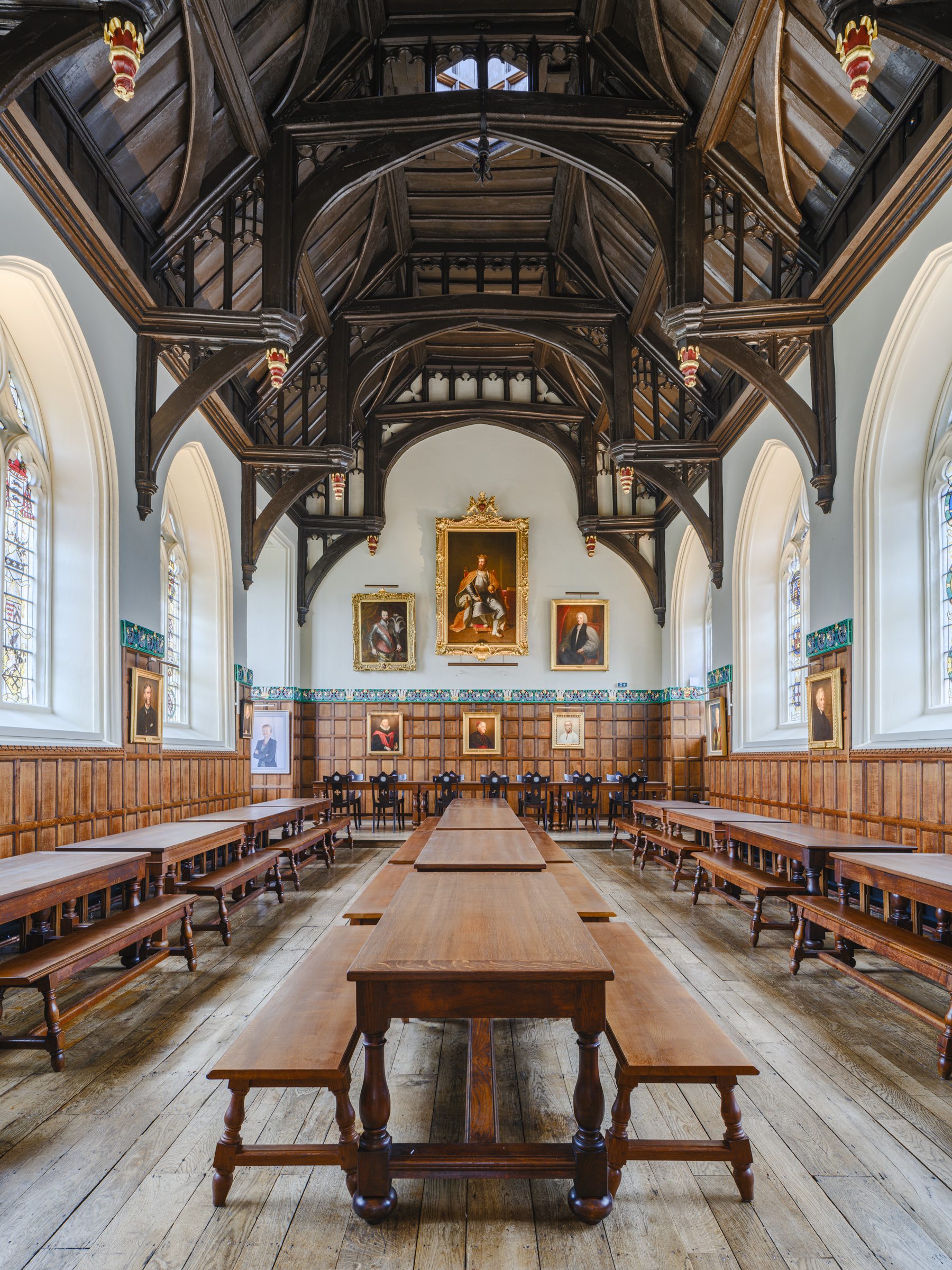 The scope of the refurbishment of the grade 1 listed Dining Hall included all necessary repairs and refinishing to the roof and floor structures and a bold new decorative plan for the Hall joinery frieze. New lighting and underfloor heating installations were sympathetically integrated into the heritage fabric. The Project team collaborated with specialist craftsmen using samples and mock-ups to develop details for new joinery, metalwork and decorated frieze painting.