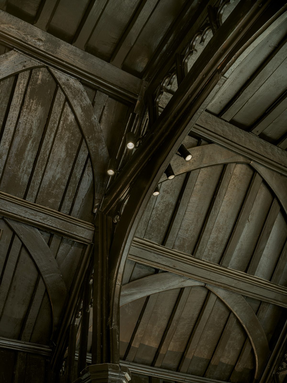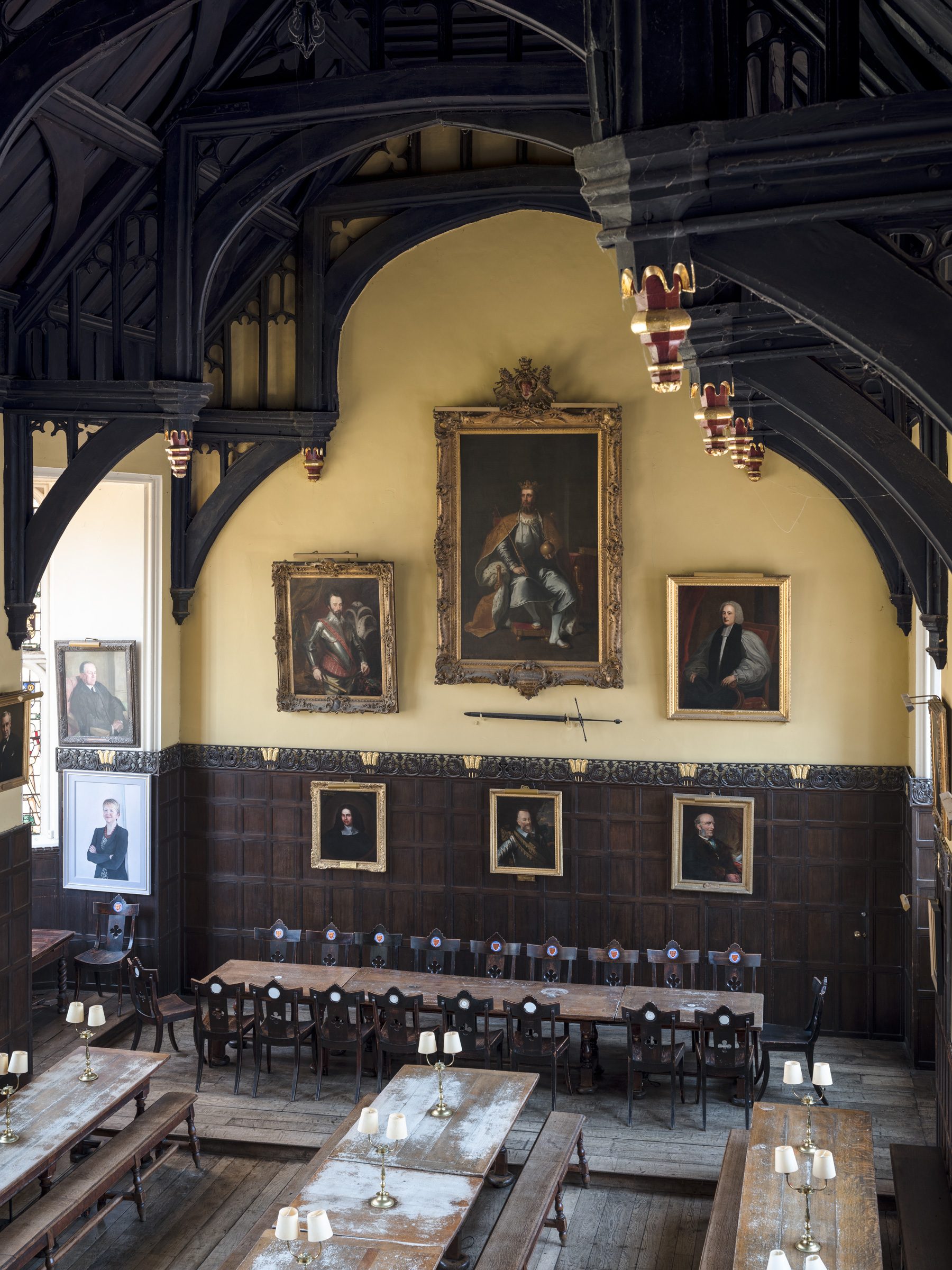 The Dining Hall structure is in Perpendicular Gothic style and dates from the 1620’s. With full scaffolding access it was possible to make a detailed survey of the impressive hammerbeam roof structure and carry out stabilising repairs. Exposure of the timber floor structure revealed a patchwork of primary beams and joists, reflecting the changing patterns of use of the over its 400-year history. Repairs were carried out to the primary beams and new oak joists were patched in. Underfloor heating was installed beneath the re-instated existing oak boards, providing more sustainable and comfortable heating while maintaining the unique character of the floor.