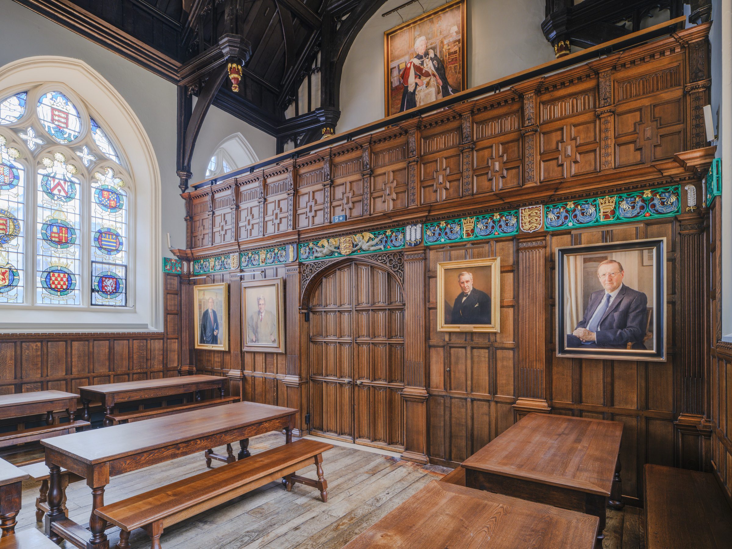 The richly carved joinery frieze, which is part of the joinery panelling by Ninian Comper dating from 1911, has been painted to new conservation plan, improving the legibility of its heraldic devices and enhancing its visual connection with the coloured stained-glass windows.