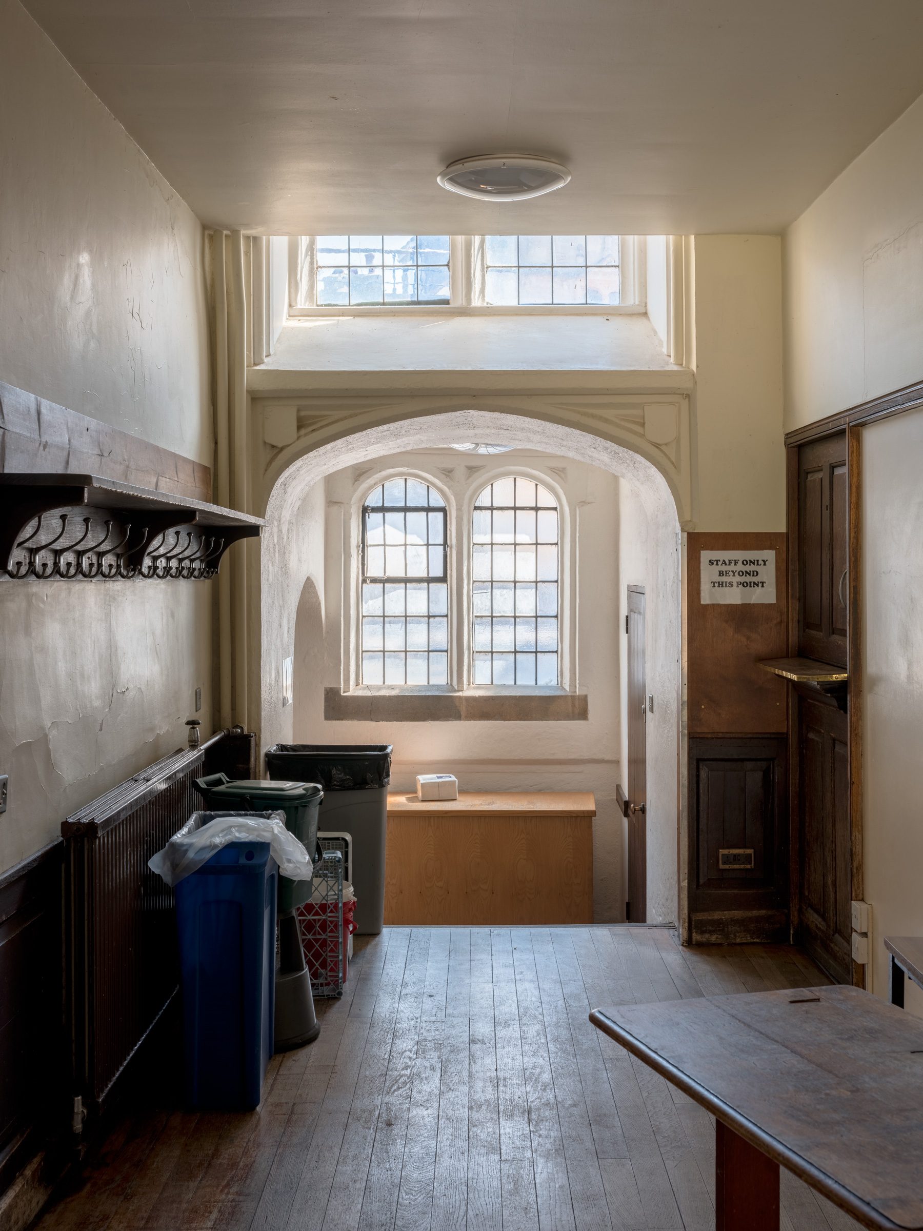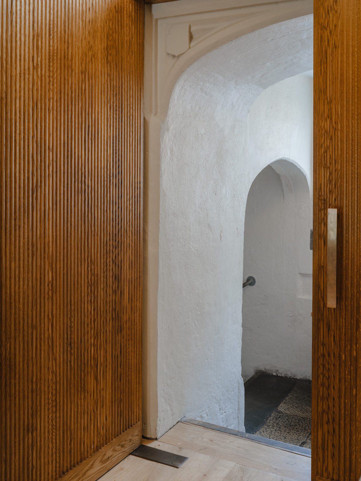 New joinery panelling and oak doors to the Screens Passage improve circulation routes and provide fire separation. The profile of the modern routed oak is derived from the fluted details of the Hall joinery.