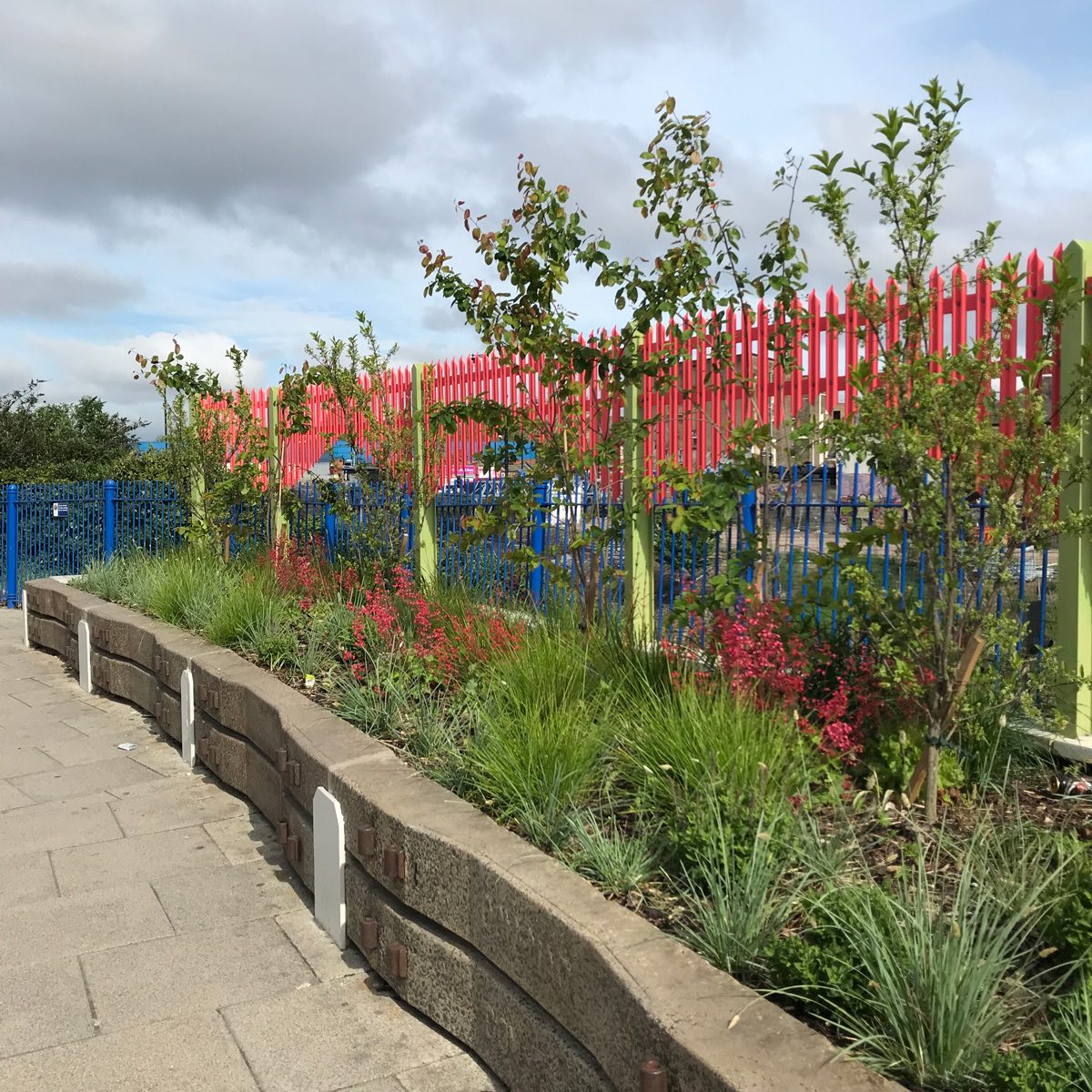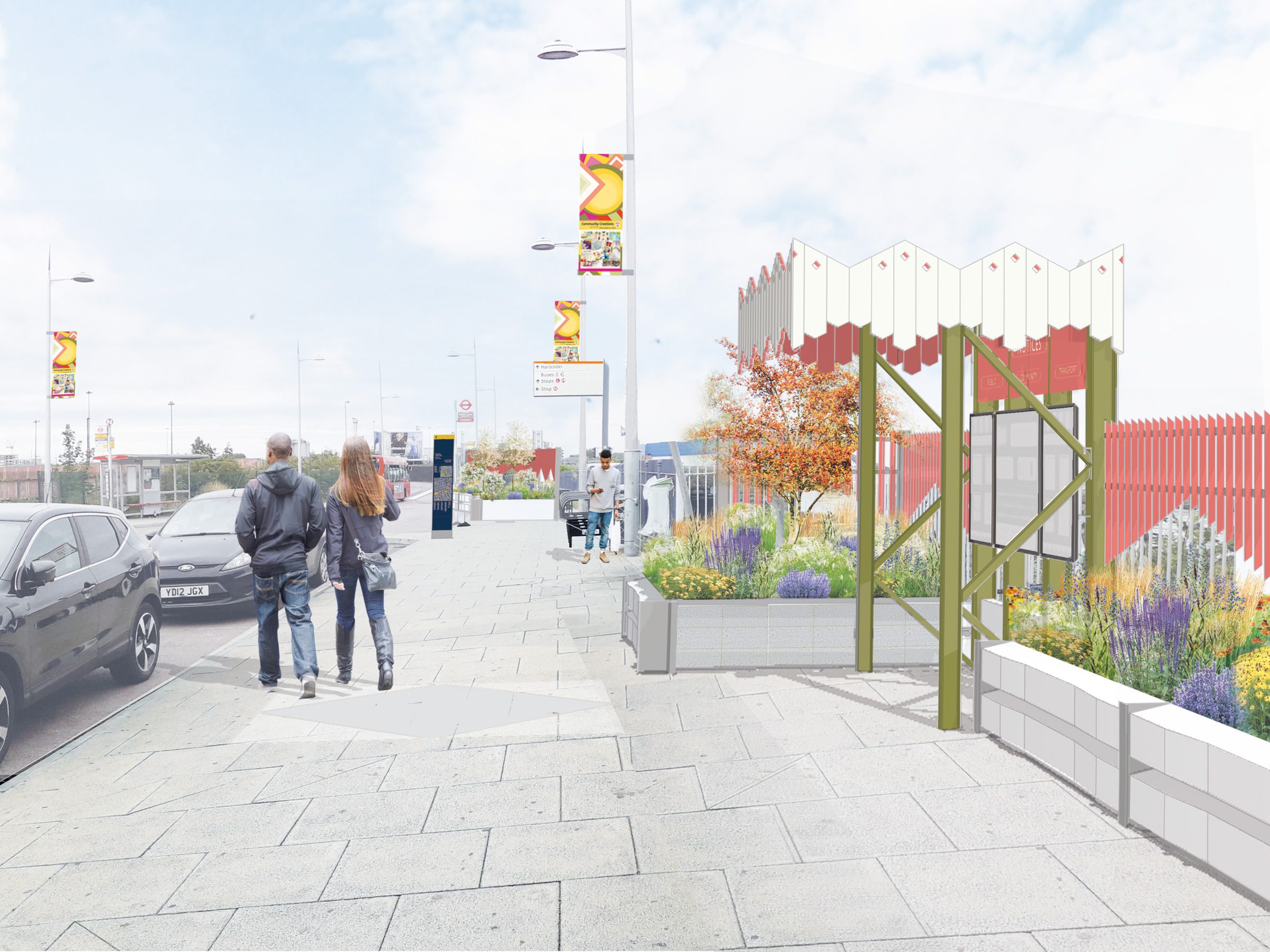 The interventions include placing new raised planters, utilising reclaimed concrete railway sleepers, along the main approach road to the ticket office. Banners have been installed on lighting columns, designed by local arts organisation Abundance Arts and featuring the work of young people from the area. The designs for the public realm were developed through workshops with young people at a local College and community engagement events. Outside the ticket office entrance, a new canopy and community noticeboards have been delivered. New planters in the square to the upper-level ticket office and existing planters on the platforms that are tended to by a local community gardening group.