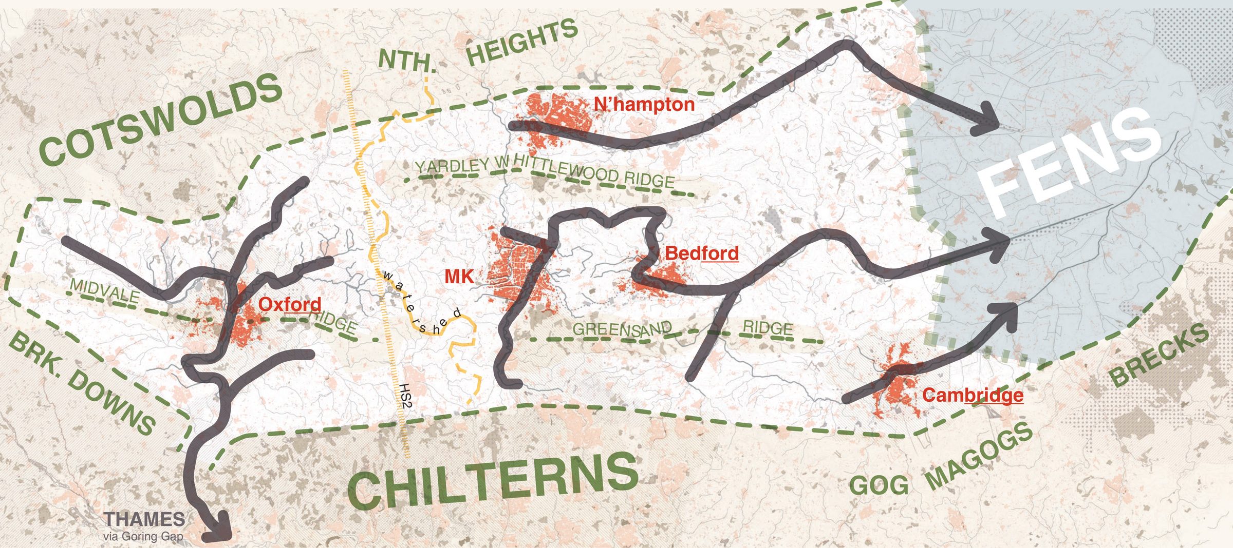 Political consensus is forming around the idea that the relatively productive towns and cities in the Arc are where national economic growth will fall, yet no available mechanism for regional planning exists and, with a government reluctant to intervene in what it regards as a task for housebuilders, it has been hard to find commissioners for spatial thinking at this scale. The consequence of poorly planned growth is evident: land suitable for building has been snapped up and used inefficiently for low-density housing. The resulting sprawl reinforces the sense of loss regarding the natural world and drives antipathy to further growth.
