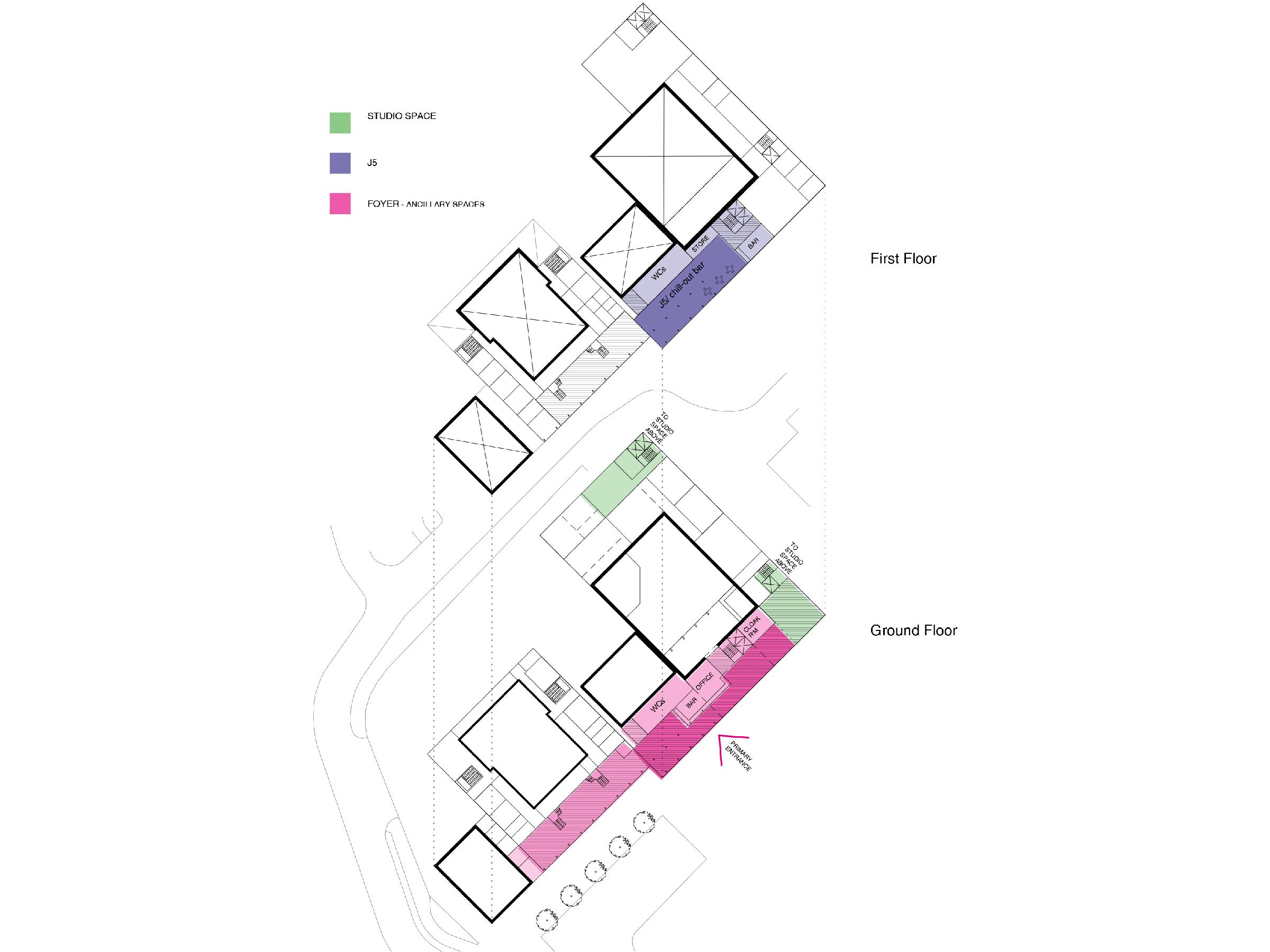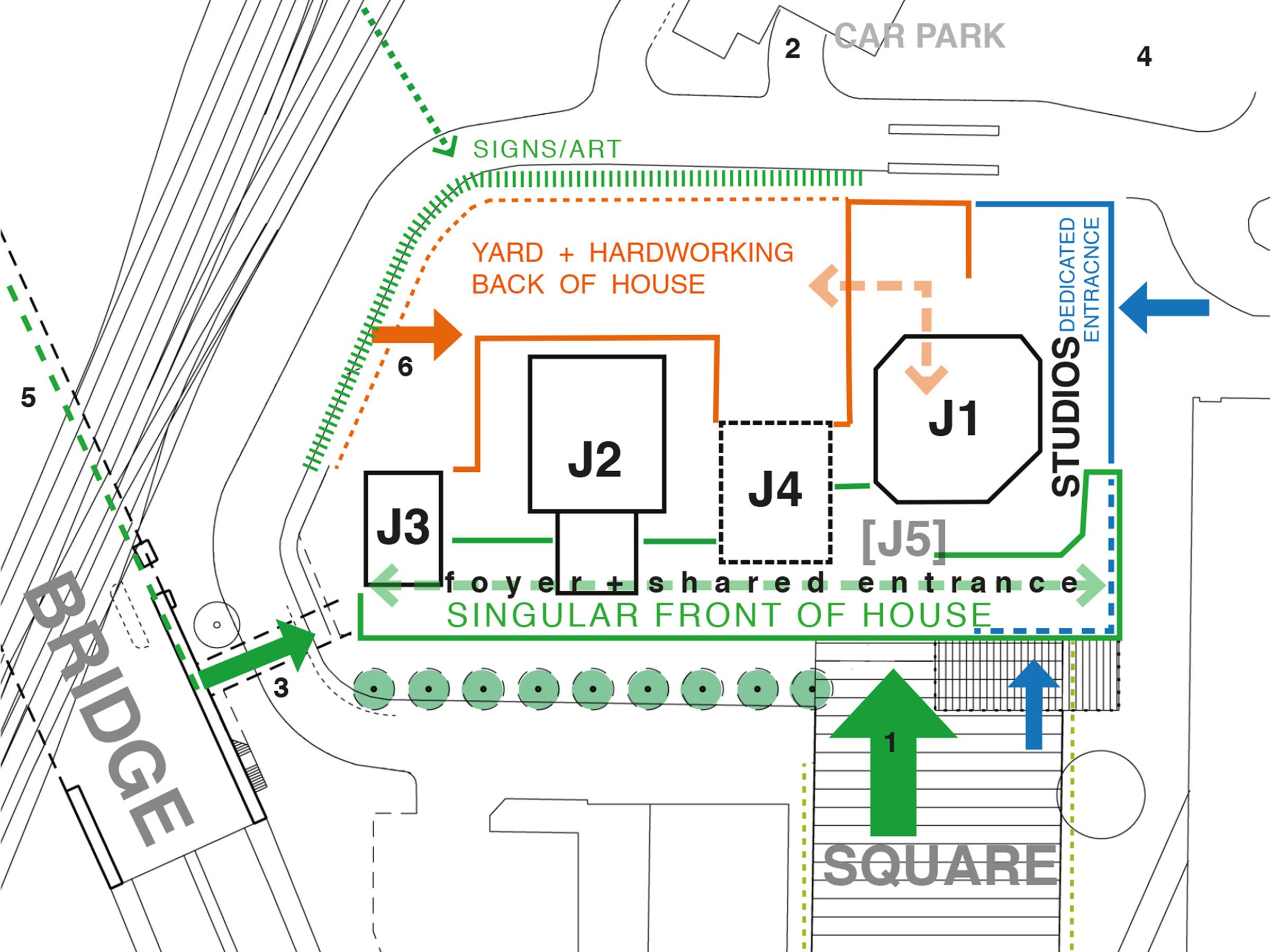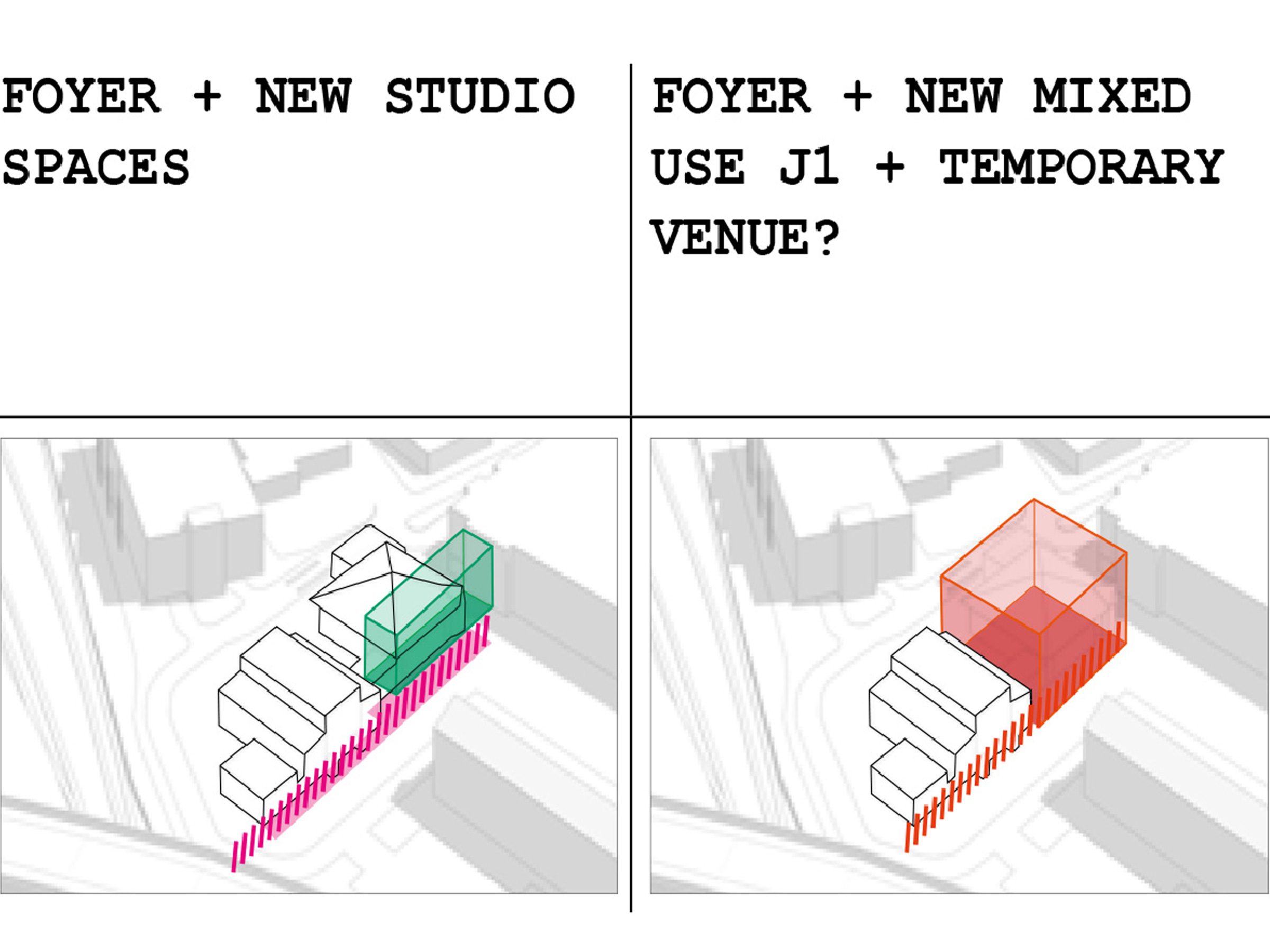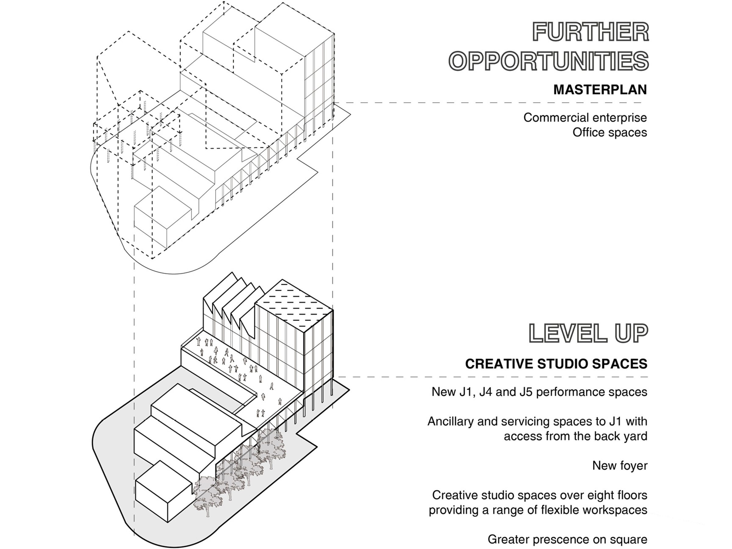 The options appraisal outlined our vision for a series of interventions and new spaces. These include a new Junction One (J1) performance space and connective foyer, and provisions for creative studio spaces that could develop a more sustainable and independent business model. A series of options have been explored from a zero-intervention approach through to the full redevelopment of the site. The preferred option looks to unify the performance venues and create a coherent front of house. Additionally, it looks to provide several flexible studio spaces for creative industry businesses. This option also allows for the improvement of the building’s environmental performance – reducing The Junction’s running costs and carbon footprint.