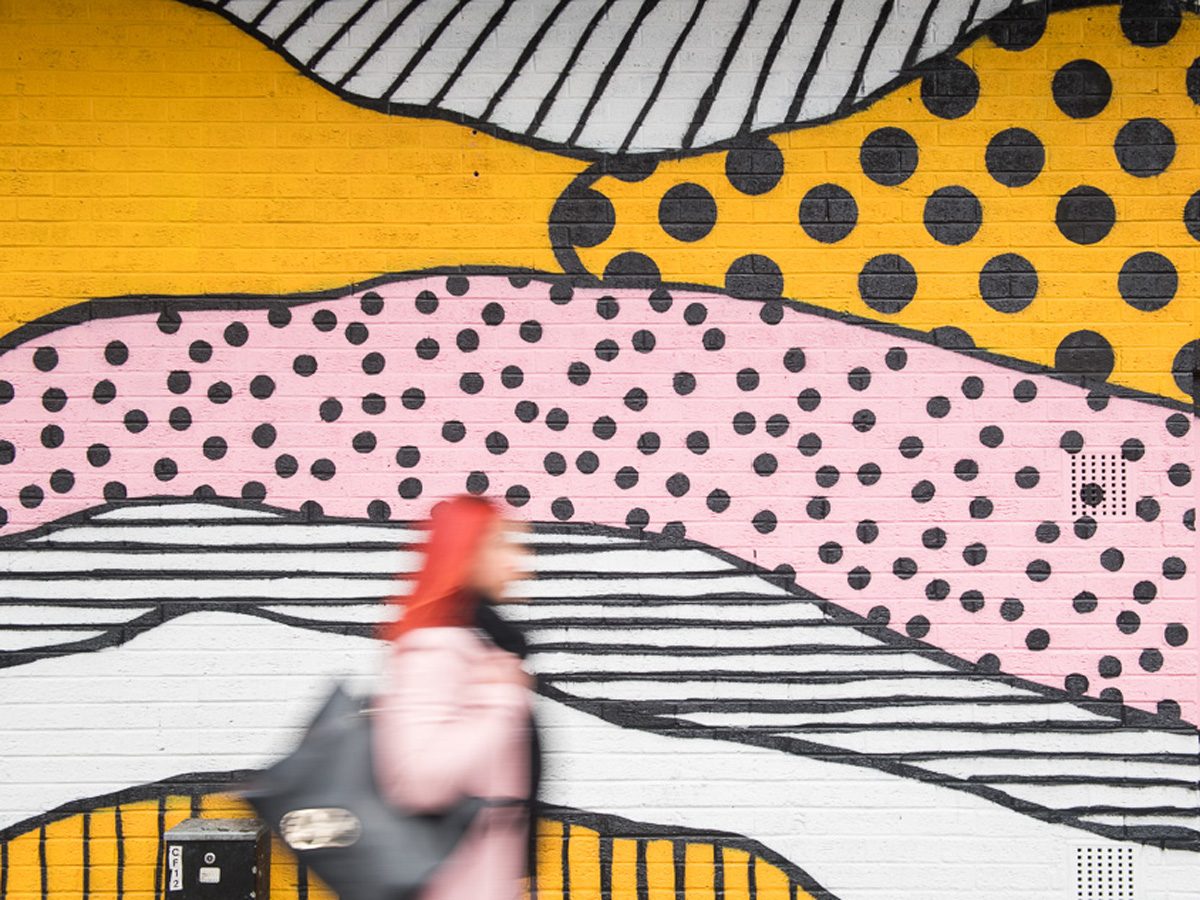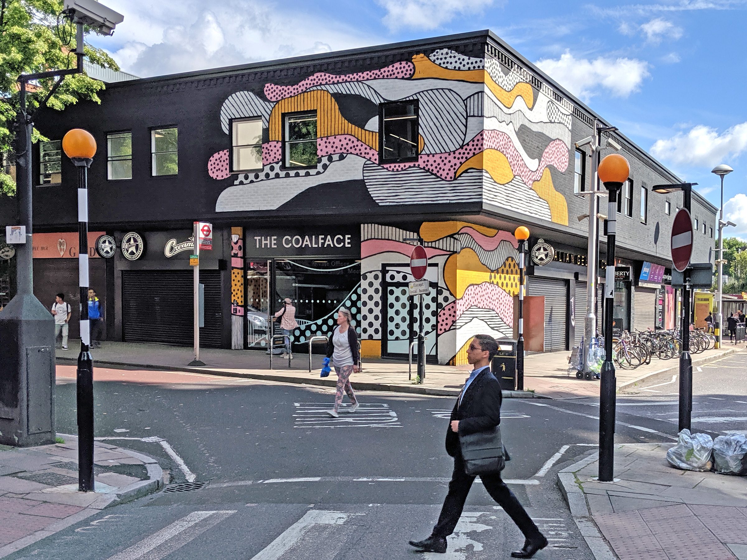 Externally the stock brick facades have been painted black, alongside a mural around the principal entrance designed by Maddison Graphic and executed by Jane-lee Palmer and Keir Ralph, creating a strong presence on the street. This graphic presence continues inside framing the entrance sequence to the workspace and creating a bold identity.