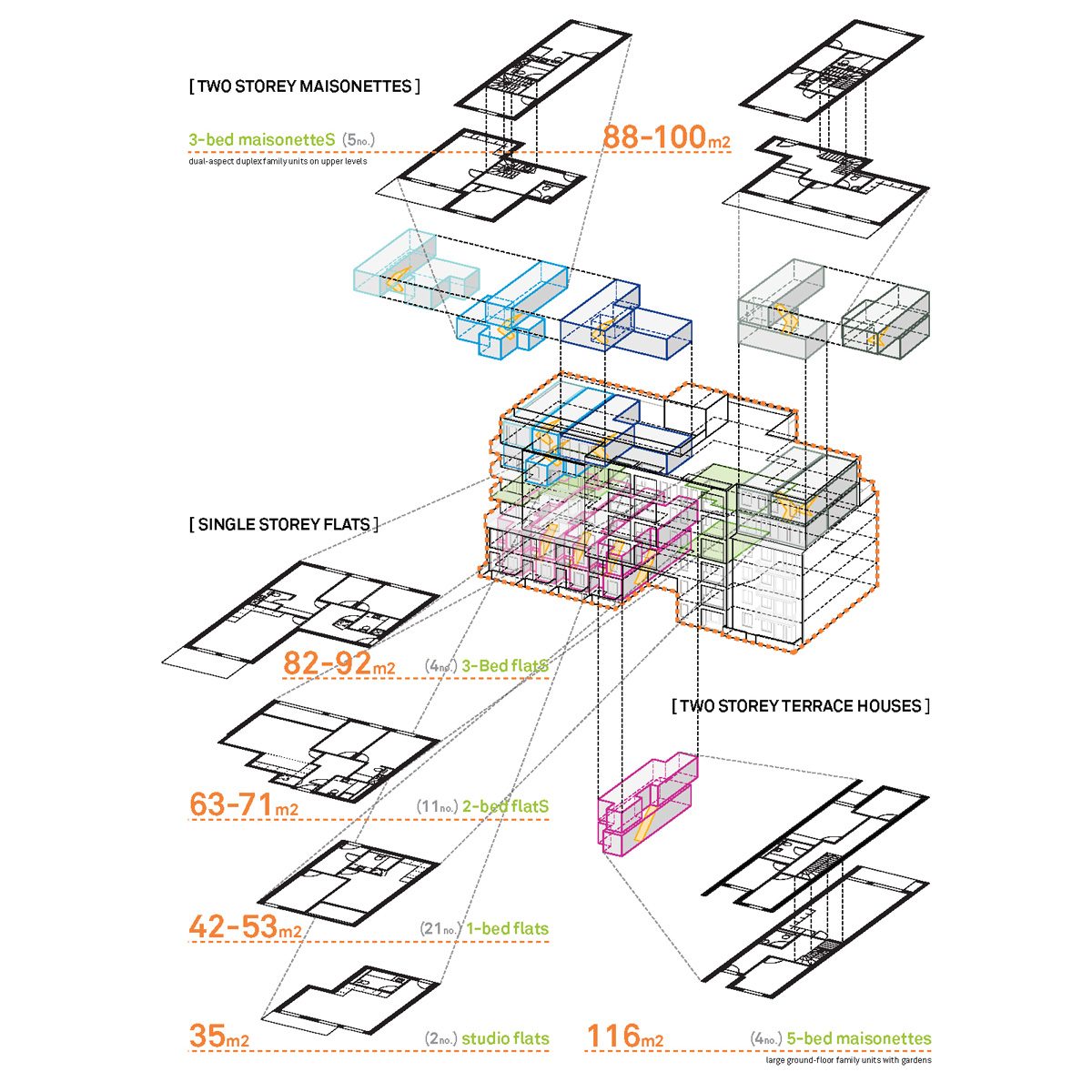 The design accommodated a wide range of different dwelling types in order to create the diversity and quality demanded by the developer, as well as meeting the policy requirements of the planning authority. These ranged from large 5-bed houses with gardens – part of the on-site provision of affordable housing – through more conventional flat types, to a series of high end interlocking penthouse maisonettes on the upper floors.