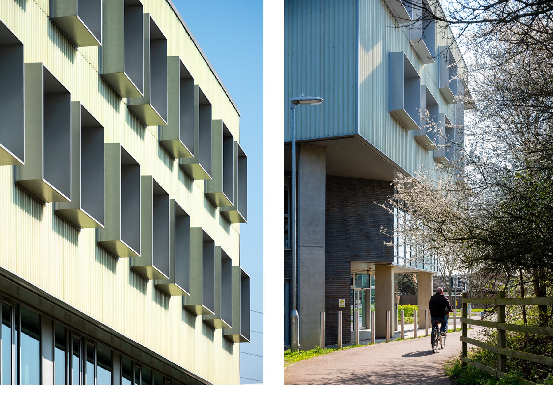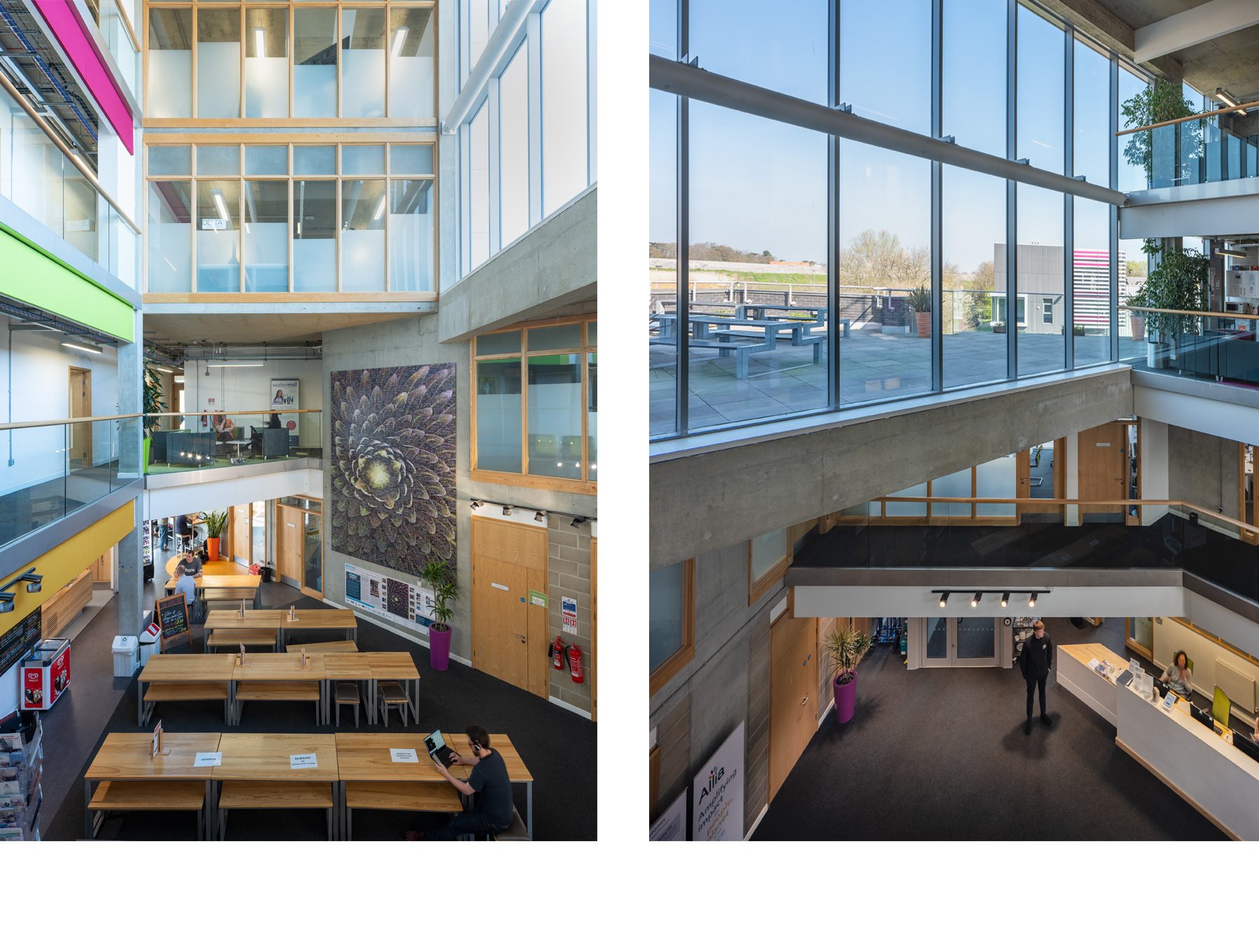 The Future Business Centre is located on the urban fringe of Cambridge. The centre is intended to nurture businesses that are good for society and the environment and was designed for the social enterprise charity Allia.