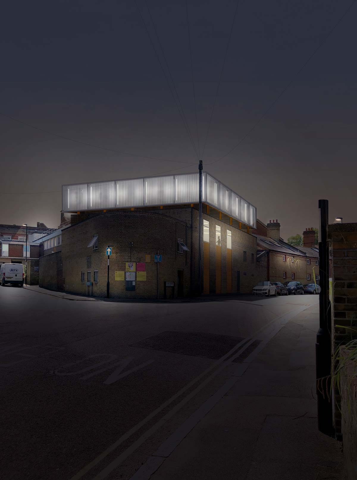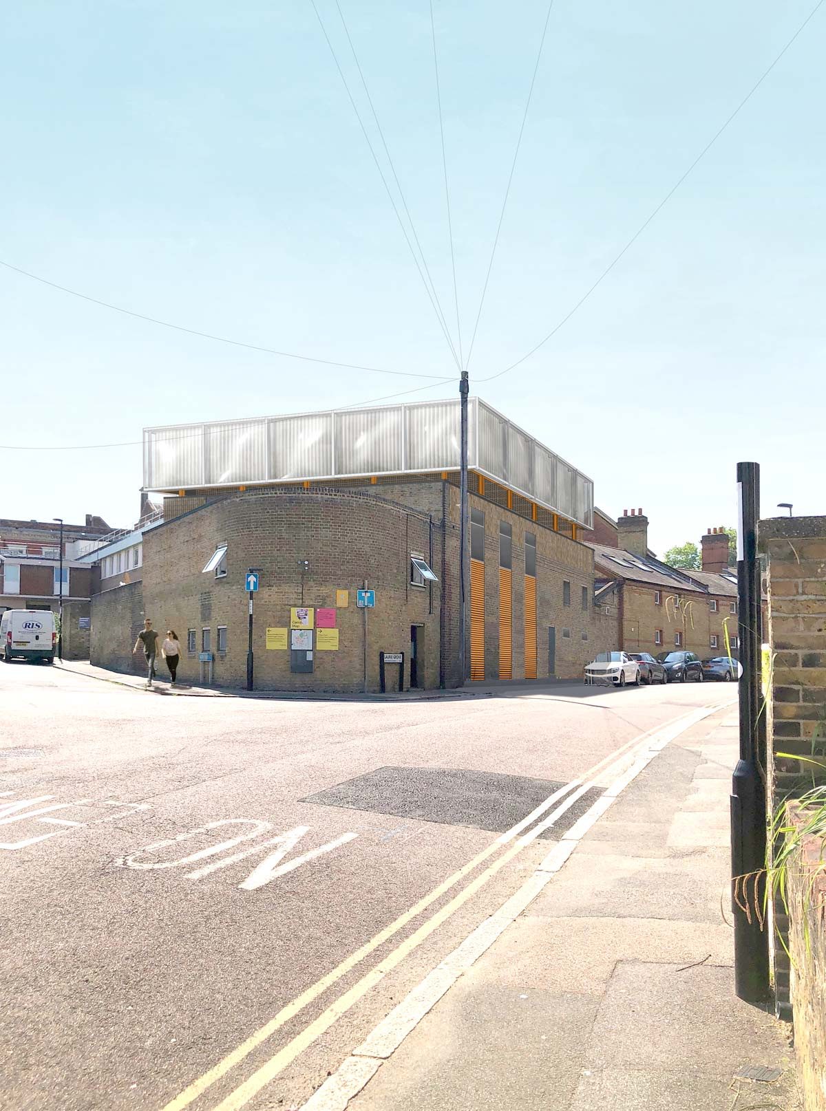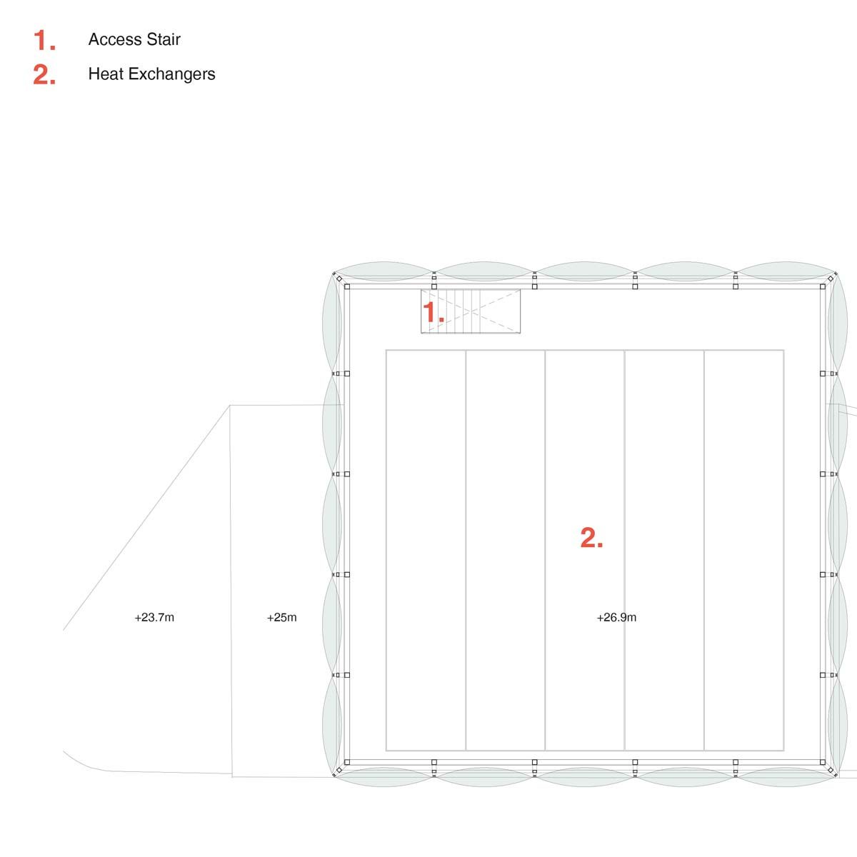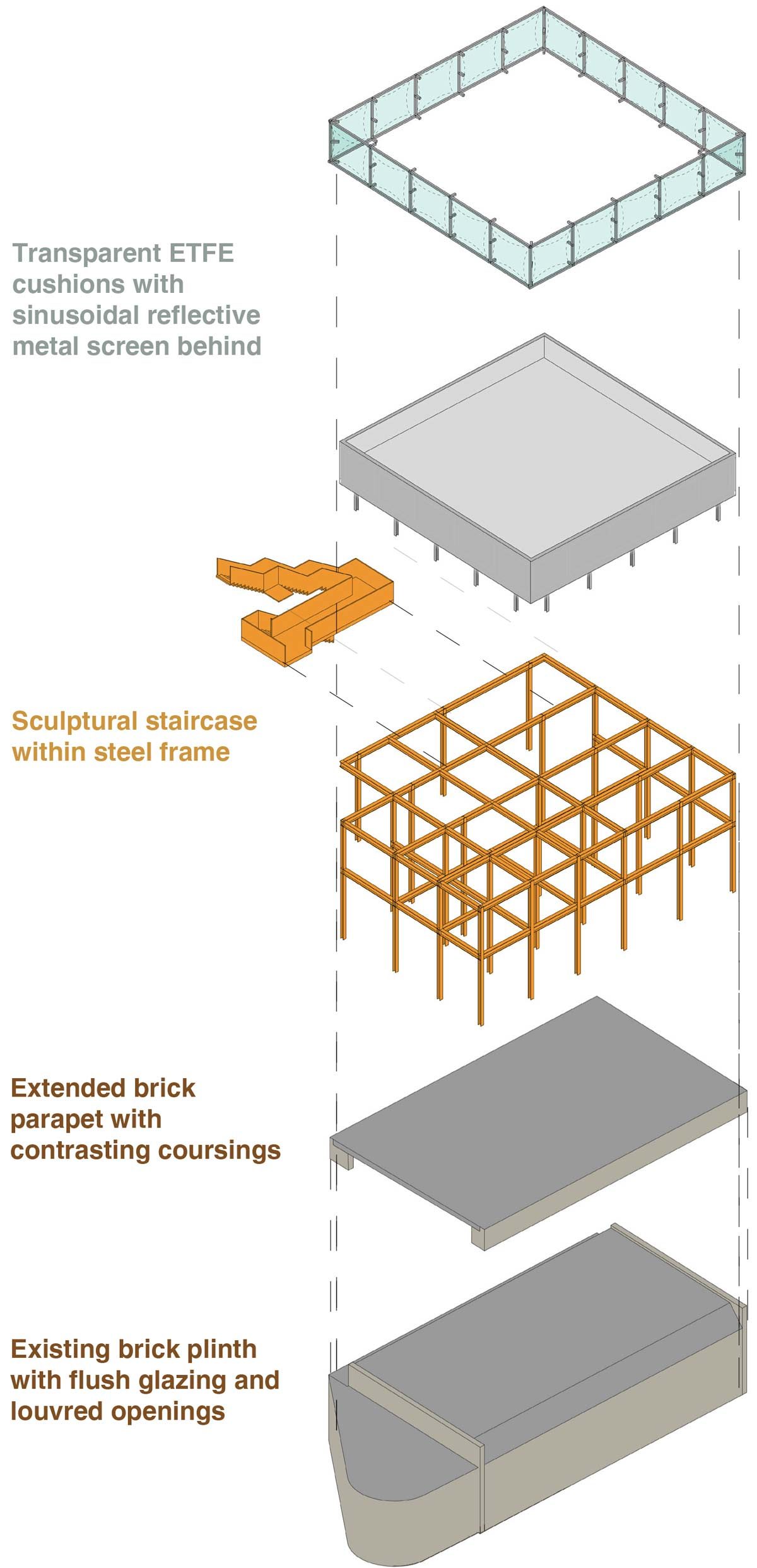 The proposal’s form and material articulation draws from local heritage structures, including the sectional water tanks of the nearby Laurie Grove Baths. The reinterpretation of these utile structures is expressed through offset massing and equally sized ETFE cushions, alluding to the building’s function as a facilitator of airflow, rather than the storage of water.