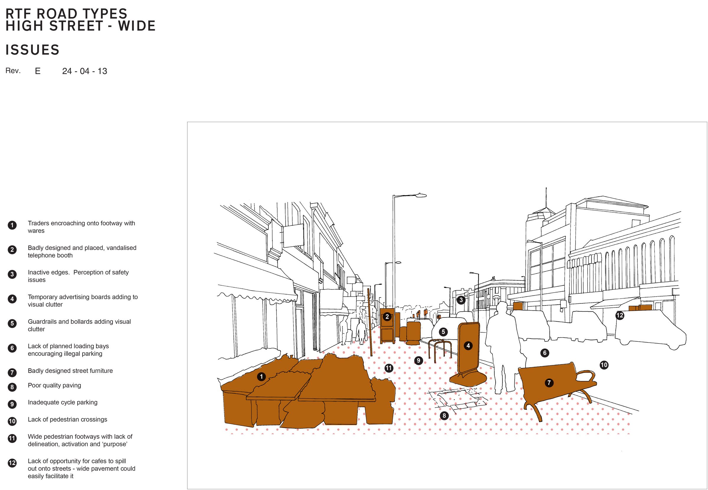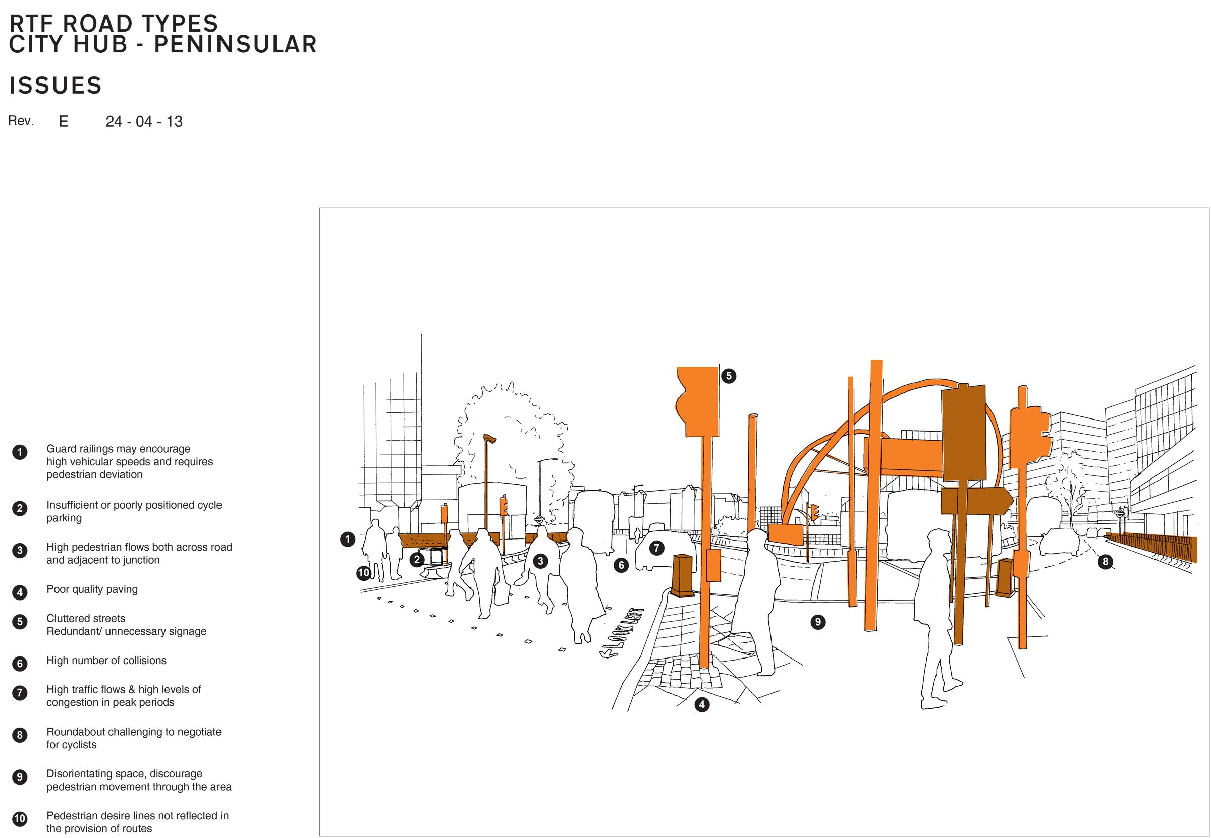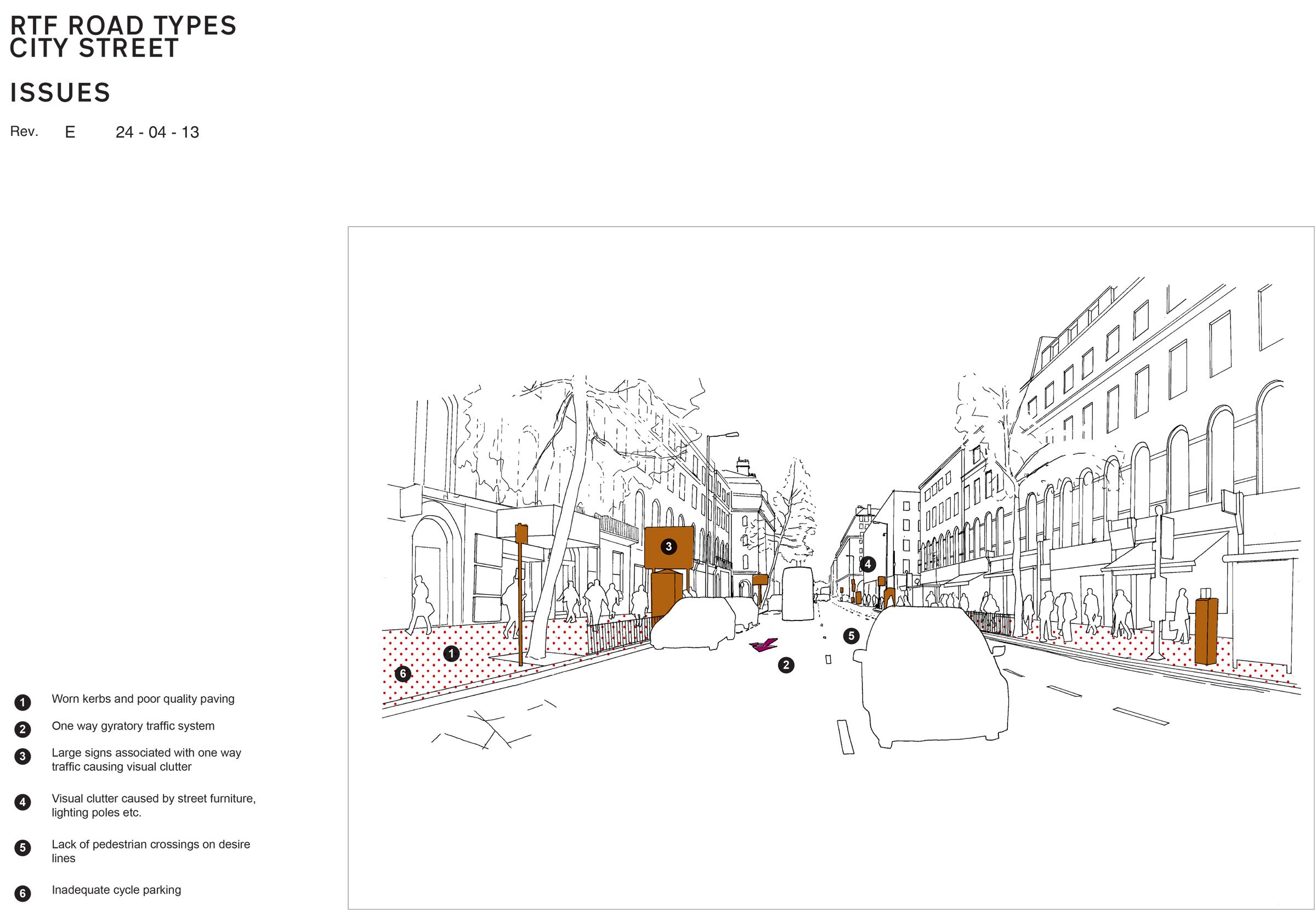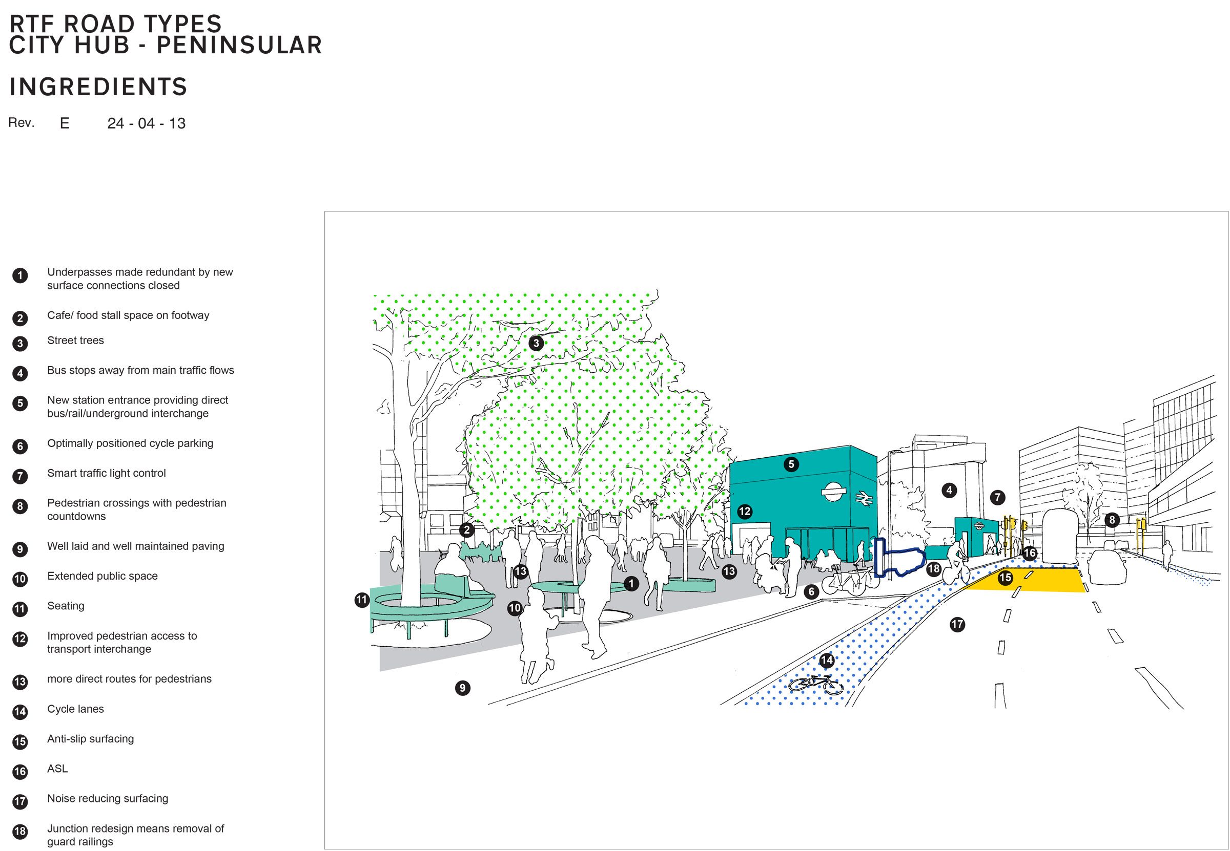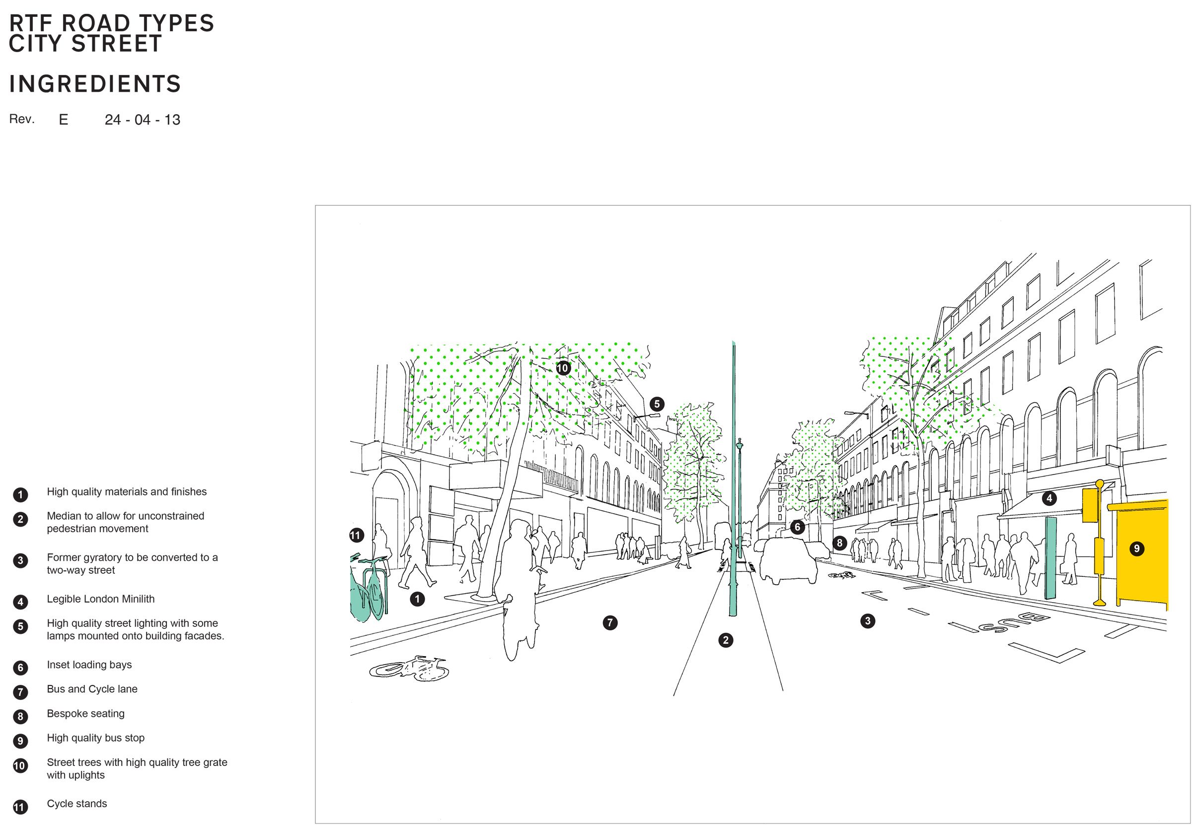 The study explored a collection of identified typologies - ranging from local residential streets to urban highways and arterial routes. Each typology was studied to identify key issues and problems - which often relate to the competing ‘place’ and ‘movement’ functions of the road. Equivalent propositional drawings identify a range of best-practice and forward-looking interventions which could help to deliver the long-term transformation of the quality of London’s public realm environment.