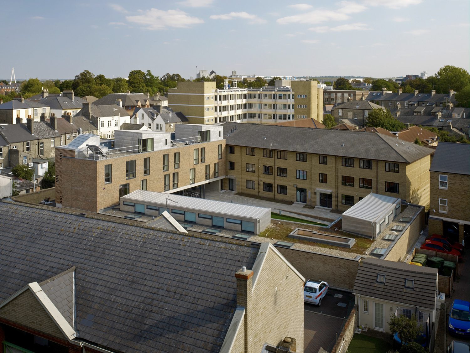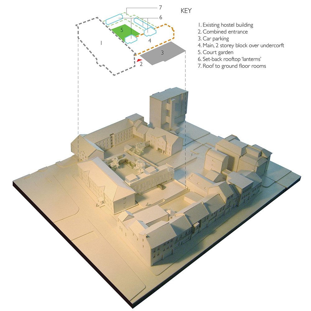 This project added twenty two graduate rooms and fellows’ sets to an existing college site in central Cambridge. The insertion restructured the planning of the site to make sense of the earlier development, which was both unresponsive to its garden setting and the potential of the site.
