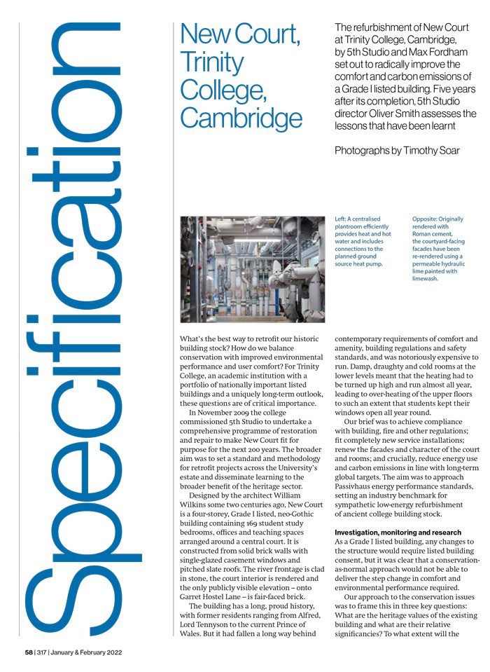 The refurbishment of New Court represents the fourth in a series of projects for Trinity College, Cambridge. This continued working relationship encompasses a range of scales and concerns, from strategic design and College estate studies, to carefully made contemporary interventions within existing buildings. All of these projects use incisive analysis and innovative design to reconcile the needs of the client and end user, with the demands made by high benchmarks for quality and heritage significance.